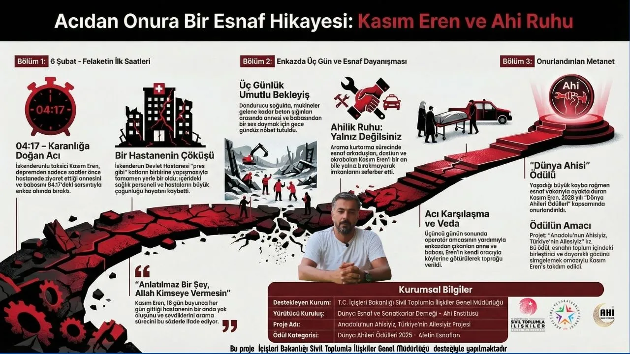 Bir Gecede Dünyası Başına Yıkılan Bir Ahi: Kasım Eren Ödüle layık görülen bir diğer isim ise Kasım Eren oldu. 6 Şubat sabahı annesini hastaneden taburcu etmeye hazırlanırken depreme yakalanan Eren, annesini ve babasını aynı enkazda kaybetti. Enkazın başında hem evlatlık görevini hem de esnaflık vakarını bir an olsun bırakmayan Kasım Eren, acısını bağrına basarak topluma örnek bir duruş sergiledi.