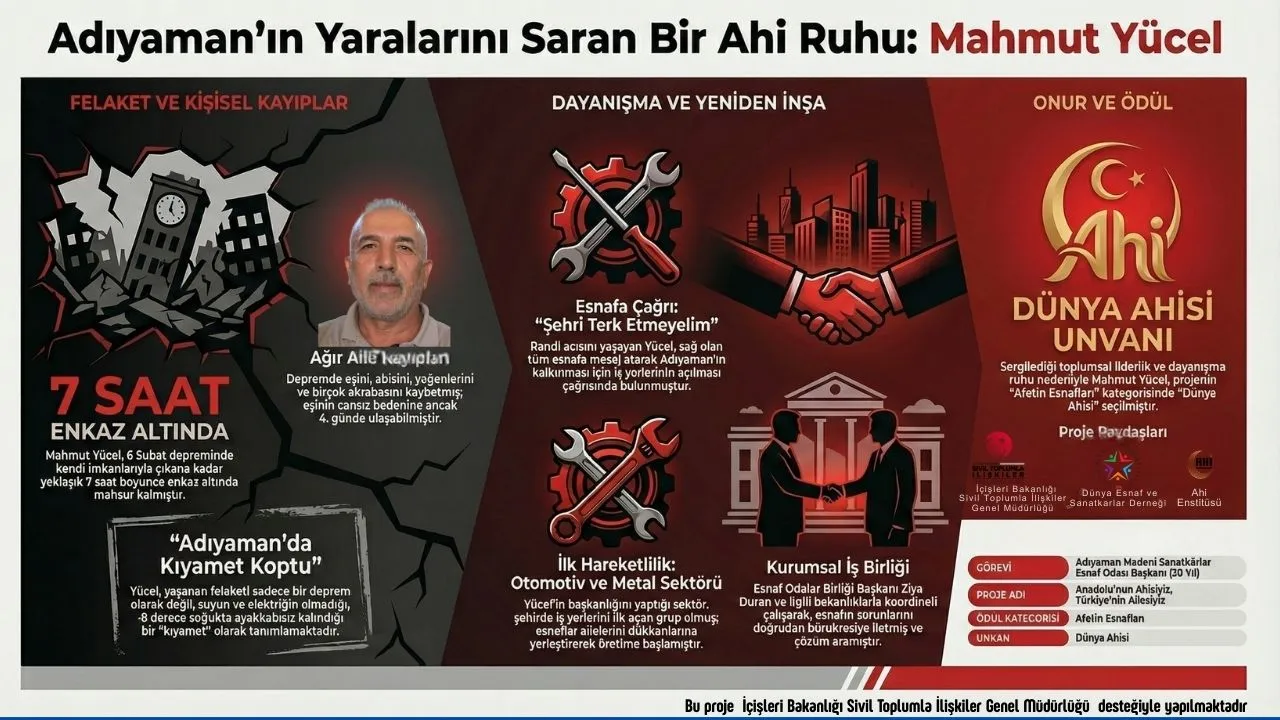 Enkazdan Odanın Başına: Mahmut Yücel Adıyaman Madeni Eşya Sanatkarları Esnaf Odası Başkanı Mahmut Yücel, 6 Şubat sabahı depremde 7 saat boyunca enkaz altında kaldı. Bu büyük felakette; eşini, ağabeyini, yeğenlerini ve ağabeyinin torunlarını kaybeden Yücel, yaşadığı tarifsiz acıya rağmen esnaf ve sanatkârların sesi olmaya devam etti. Ahilik sancağını Adıyaman’da yere düşürmeyen Yücel’in bu vakur duruşu, 2025 Dünya Ahileri Ödülü ile onurlandırıldı.