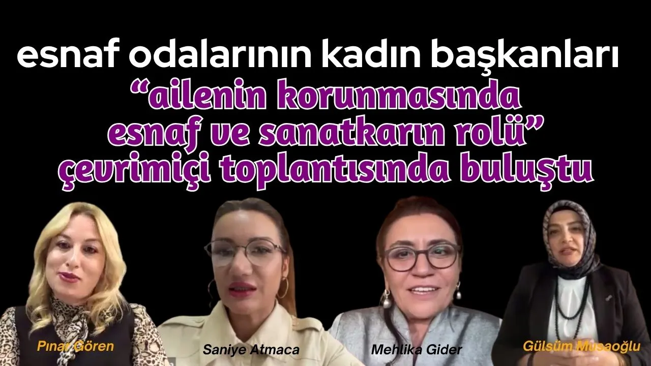 Esnaf odalarının kadın başkanları Dünya Esnaf Sanatkarlar Derneği tarafından İçişleri Bakanlığı Sivil Toplumla İlişkiler Genel Müdürlüğü desteğiyle düzenlenen "Anadolu'nun Ahisiyiz, Türkiye'nin Ailesiyiz" projesinin “Ailenin korunmasında esnaf ve sanatkarın rolü” çevrimiçi toplantısında bir araya geldi. Dünya Esnaf Sanatkarlar Derneği Ahi Enstitüsü Başkanı gazeteci-yazar Fehmi Çalmuk'un yönettiği Akhisar Lokantacılar Kebabçılar Esnaf Odası Başkanı Pınar Gören, Diyarbakır Terziler Odası Başkanı Saniye Atmaca, Erzurum Oltu Esnaf ve Sanatkar Odası Başkanı Ümmühan Gülsüm Musaoğlu ile Kadın İşverenleri ve Sanayicileri Derneği (KASİDER) Başkanı Mehlika Gider katıldı.
