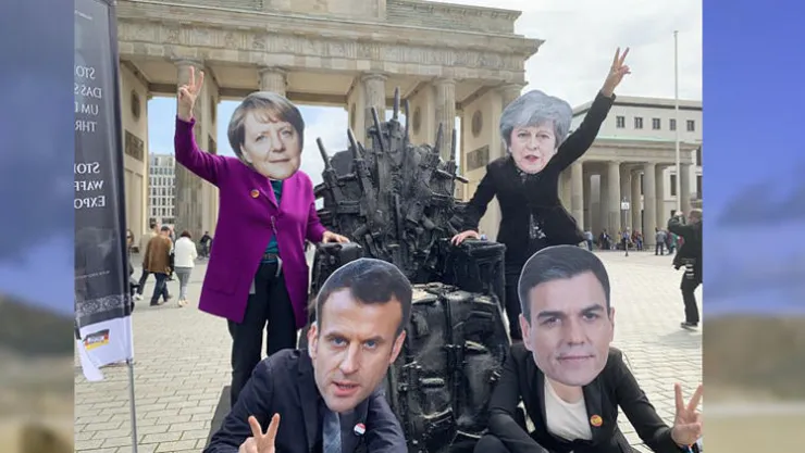Çeşitli sivil toplum örgütlerinin yer aldığı ‘Çığlık eylemi-Silah ticaretini durdurun’ adlı inisiyatif tarafından tarihi Brandenburg Kapısı (Brandenburger Tor) önündeki 18 Mart Meydanı’nda düzenlenen protestoda, Yemen’deki savaşa katılan ükelere silah satan Almanya ve diğer AB ülkelerine tepki gösterildi. Üzerinde silah motiflerinin bulunduğu siyah bir tahtın meydana konulduğu gösteride, 4 kişi de Almanya Başbakanı Angela Merkel, Fransa Cumhurbaşkanı Emmanuel Macron, İspanya Başbakanı Pedro Sanchez ve İngiltere Başbakanı Theresa May’in maskelerini takarak eyleme katıldı. FELAKETTE ÜRETTİĞİMİZ SİLAHLAR KULLANILIYOR İnisiyatifin sözcülerinden Christine Hoffmann, Yemen’de Alman ve diğer bazı Avrupa ülkelerinin ürettiği silahlarla bombalar atıldığını ve bugünün en büyük insani felaketin yaşandığını belirterek, Alman şirketlerin Suudi Arabistan, Birleşik Arap Emirlikleri, Mısır, Ürdün gibi Yemen’deki savaşa katılan ülkelere Alman hükümetinin onayıyla silah sattığını söyledi. Almanya, Fransa, İngiltere, İtalya ve İspanya’da üretilen silahların Yemen’deki savaşta kullanıldığına işaret eden Hoffmann, bu ülkelerin de Yemen’deki insani felaketten sorumlu olduğunu vurguladı. Alman hükümetinin AB düzeyinde Yemen’deki savaşa katılan ülkelere silah satılmaması için çaba sarf etmesini talep eden Hoffmann, savaşa katılan ülkelere silah ambargosu uygulanmasını istedi.