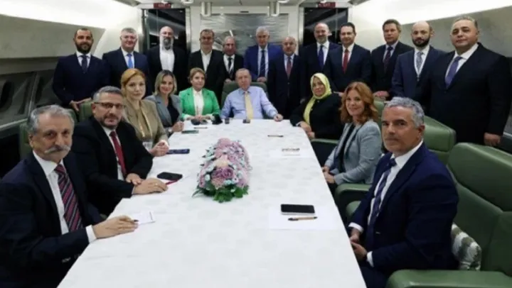 Cumhurbaşkanı Recep Tayyip Erdoğan, dün Azerbaycan'da gerçekleşen Türk Devletleri Teşkilatı 12. Zirvesi'ne katılmıştı. Azerbaycan'daki temaslarını tamamlayarak yurda dönüş yapan Erdoğan, uçakta beraberindeki gazetecilerin sorularını yanıtladı. TBMM'deki 1 Ekim resepsiyonunda çekilen fotoğraf kareleriyle ilgili açıklama yapan Erdoğan, 'O kare, gerçek Türkiye fotoğrafıdır. Birileri Türkiye'yi kamplara bölünmüş, paramparça gibi göstermeye çalışıyor, ancak hakikat oradaki birlik ve beraberlik tablosudur. O tablonun parçası olamayanlar, oturup kendilerini hesaba çekmelidir.' dedi.