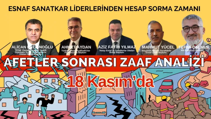 Dünya Esnaf ve Sanatkârlar Derneği bünyesindeki Ahi Enstitüsü, İçişleri Bakanlığı desteğiyle esnaf ve sanatkârların afetler sonrası karşılaştığı zorlukları mercek altına alıyor. 'Anadolu'nun Ahisiyiz, Türkiye'nin Ailesiyiz' projesi kapsamındaki kritik toplantıda, özellikle 6 Şubat depremlerinin üçüncü yılına girilirken, afet yönetimindeki aksaklıklar ve çözüm önerileri masaya yatırılacak.
