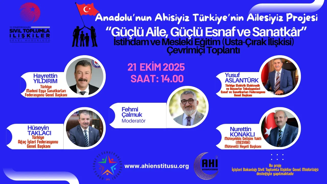 Dünya Esnaf ve Sanatkarlar Derneği (AHİ Enstitüsü), İçişleri Bakanlığı Sivil Toplumla İlişkiler Genel Müdürlüğü desteğiyle yürüttüğü "Anadolu’nun Ahisiyiz, Türkiye’nin Ailesiyiz" projesinin ikinci çevrimiçi toplantısını düzenliyor.