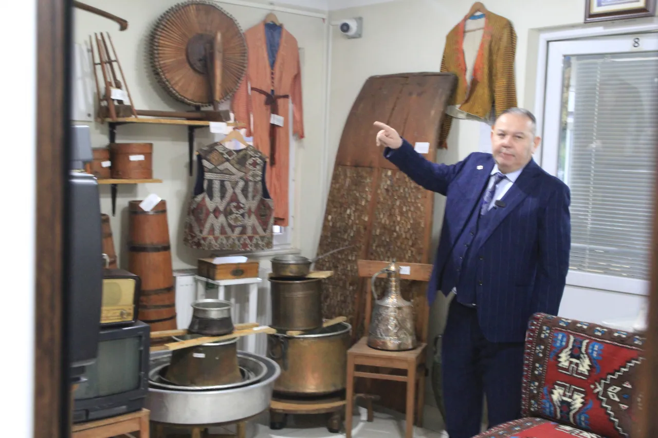 Hayrullah Türker: Tabii... Mesela şu gördüğünüz terlikler 14 yıl fabrika işlettim, bunların her bir modelini geliştirmek 9 ayımı almıştı. 67'ye yakın modelimiz vardı ve her biri patentlidir. 20 yıl önce tasarladığımız plaj çantası, İtalya'dan getirdiğimiz ham maddelerle yapıldı. Şu daktiloyu askerde kullanmıştım. Hesap makinesi, hesap makineleri... Şu mesela benim eşimin rahmetli Döndü teyzesinin hediyesidir, 70 yıllıktır.