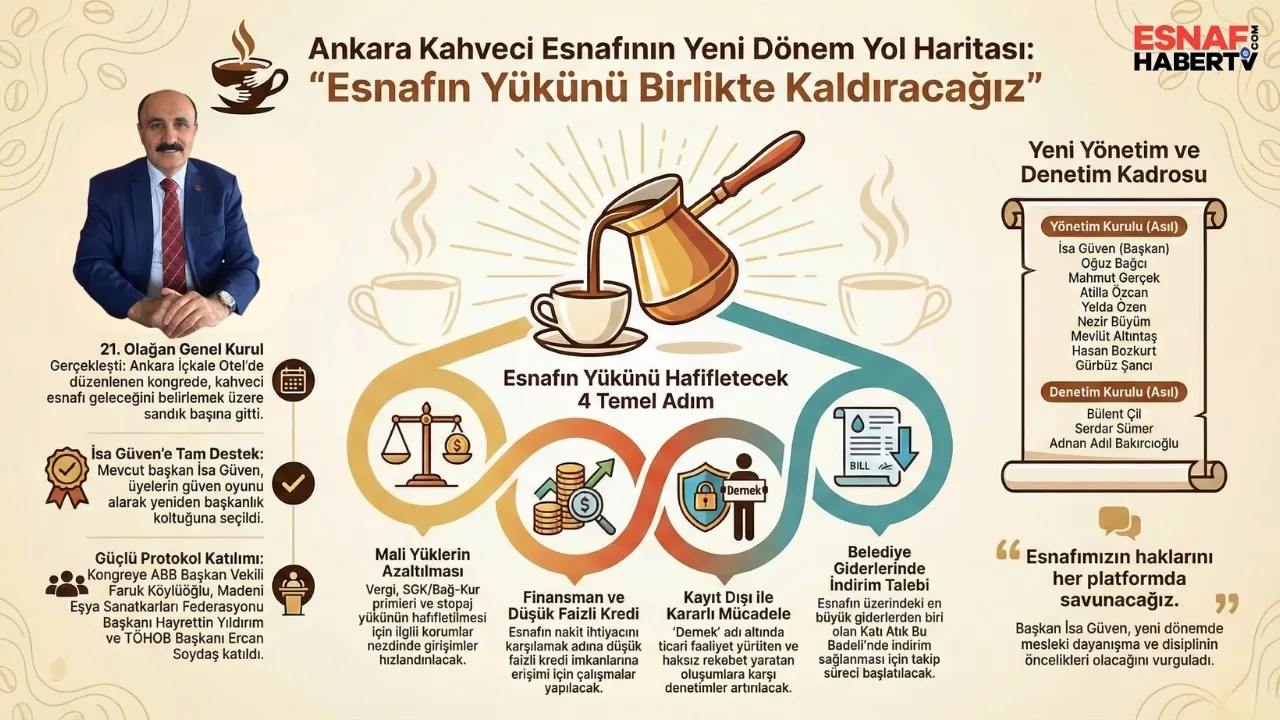 Ankara Kahveciler Esnaf Odası'nın 21. Olağan Genel Kurulu'nda güven tazeleyen Başkan İsa Güven, yeni dönem için kararlılık mesajı verdi. Yoğun katılımla gerçekleşen kongrede konuşan Güven, 'Kayıt dışıyla mücadeleden maliyetlerin düşürülmesine kadar esnafımızın her derdiyle dertlenmeye devam edeceğiz' dedi.