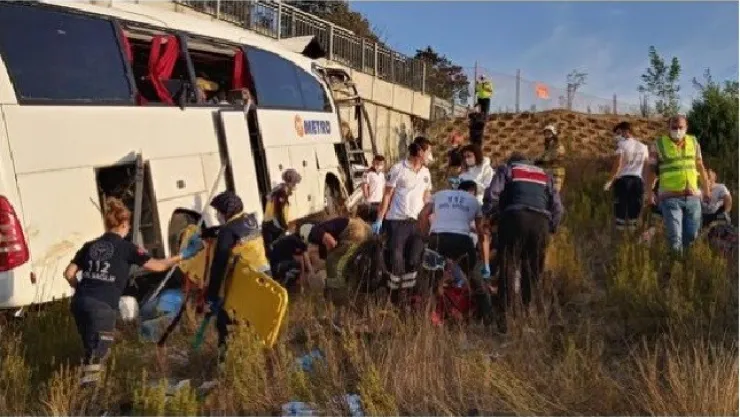Sarıyer Kuzey Marmara Otoyolu’nda yolcu otobüsü kaza yaptı. İlk belirlemelere göre 26 kişi yaralanırken 5 kişi hayatını kaybetti. Haber verilmesi üzerine olay yerine çok sayıda itfaiye ve sağlık ekibi sevk edildi. İtfaiye ve sağlık ekiplerinin yaralıları kurtarma çalışmaları devam ediyor. İlk belirlemelere göre 26 kişinin yaralandığı kazada 5 kişinin öldüğü öğrenildi. VALİLİK'TEN AÇIKLAMA İstanbul Valiliği, Kuzey Marmara Otoyolu'nda meydana gelen trafik kazasında 5 kişinin öldüğünü 25 kişinin ise yaralandığını açıkladı. İstanbul Valiliği'nden yapılan açıklamada şöyle denildi: Karabük'ten İstanbul'a seyir halindeki bir şehirlerarası yolcu otobüsü, bugün saat 07.00 sıralarında, Kuzey Marmara Otoyolu'nda Çiftalan Köprüsü mevkiinde bariyerlere çarparak yoldan çıkmıştır. Olay yerine derhal Jandarma, Polis, 112 Acil Servis, İtfaiye ve AFAD ekipleri sevk edilmiştir. 112 Acil Servis ekiplerimizden alınan ilk bilgilere göre; kazada 5 vatandaşımız hayatını kaybederken, 3'ü çocuk, 7'si yetişkin 10 yolcumuzun durumu ağır olmak üzere, 25 yolcumuz hastaneye sevk edilmiştir. Kaza nedeniyle geniş çaplı soruşturma başlatılmıştır."