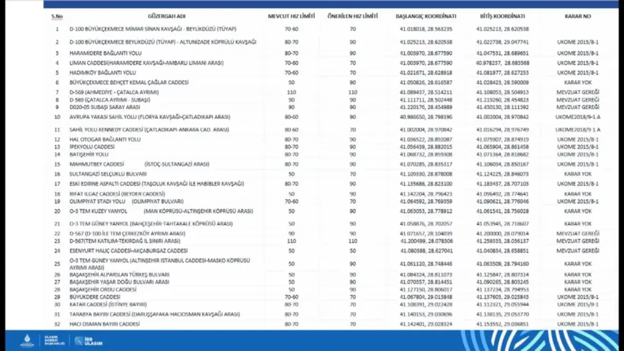 Toplantıda konuşan Ulaşım Koordinasyon Şube Müdürü Rıdvan Oğul, "Levhalarla ilgili düzenlemeler yeniden yapıldı. Avrupa Yakası'nda 57 noktada, Anadolu Yakası'nda da 27 güzergahta olmak üzere toplam 84 güzergahta hızlar yeniden belirlendi." dedi.