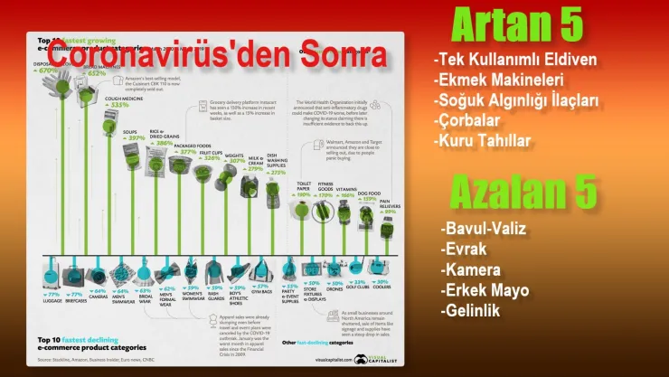 Eşi görülmemiş bir olay ve tatil iptalleri dalgası, insanların tükettiği ürünler üzerinde büyük bir etkiye sahip . Örneğin, bavullar ve valizler, kameralar ve erkek mayoları satışlarda düşüş yaşadı. Aşağıdaki en hızlı azalan 100 kategorinin tam listesine bakın:Yeni normal?