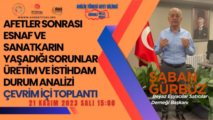 Moderatörlüğünü gazeteci-yazar Dünya Esnaf ve Santakarlar derneği/ Ahi Enstitüsü Başkanı Fehmi Çalmuk’un yapacağı çevrimiçi toplantıların ikincisi ise 21 Kasım 2023 Salı günü saat: 15:00’de “AFETLER SONRASI ESNAF VE SANATKARIN YAŞADIĞI SORUNLAR / ÜRETİM VE İSTİHDAM DURUM ANALİZİ” başlığıyla yapılacak.